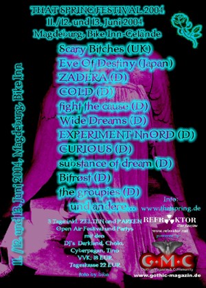 LineUp 2004: Cold, Bifrøst, Eve of Destiny, Scary Bitches, Zadera, Wdie Dreams, Substance of Dream, Experiment Nnord, Silvery, Bats in the Belfry, Golden Apes, Curious, Fight the Cause, The Groupies