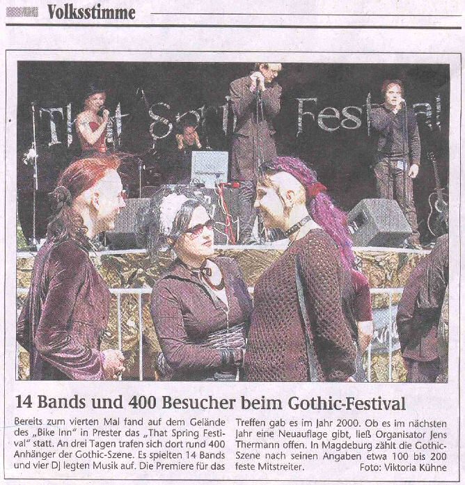In diesem Jahr fand das That Spring erstmalig zwei Wochen nach Pfingsten statt. Bereits acht Monate vorher standen die ersten sechs Bands fest, viele weitere hatten sich zu diesem Zeitpunkt schon beworben. Mit "Eve Of Destiny" aus Japan und den "Scary Bitches" aus Großbritannien konnten wir wieder zwei interessante internationale Acts verpflichten, die nicht auf jedem Festival spielen. Zusammen mit den spannenden Bands aus Deutschland konnten die Besucher an drei Tagen 14 Bands live erleben.