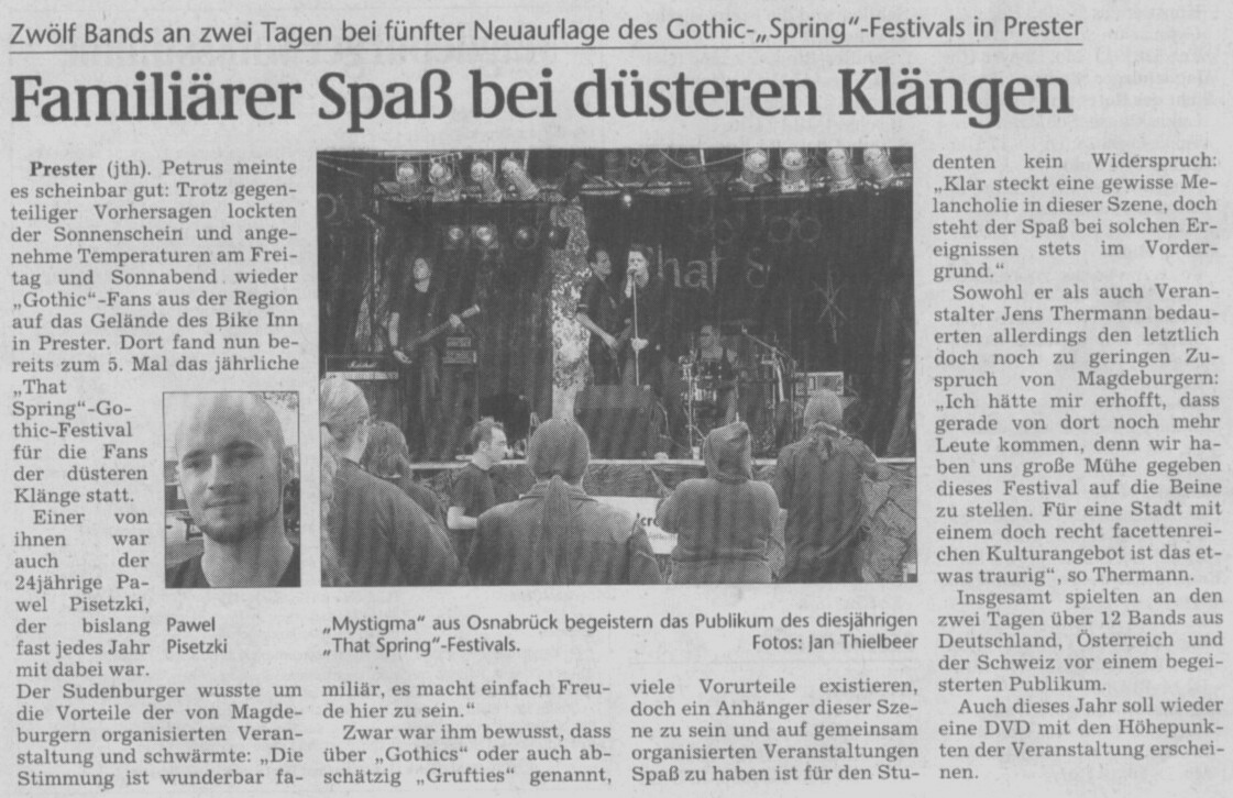 ...das fünfte "That Spring Festival". Was soll ich sagen, es war das bisher beste, was wir an Organisation, Vorbereitung und Zusammenarbeit bieten konnten. Es war familiär und emotional. All die Worte, Einträge im Gästebuch und in diversen Foren, das was Medien schreiben und erzählen, all das was alte Freunde und neue Besucher sagen, gibt uns Recht in der Annahme, dass auch nichtkommerzielle, mit Liebe und Herzblut gestaltete Veranstaltungen immer noch einen Platz haben in dieser so komplexen Szene.